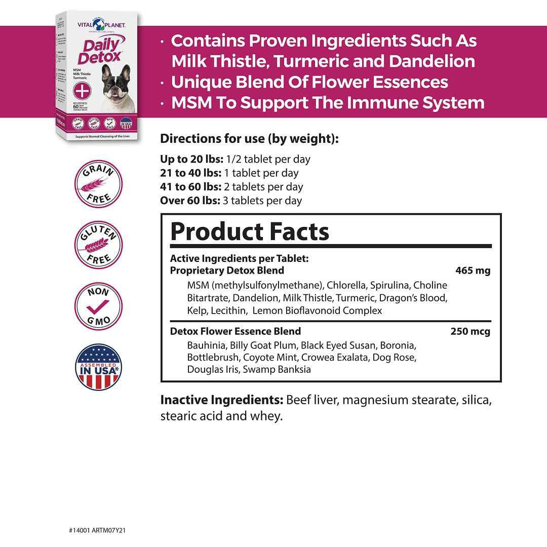 Disfrute de la tranquilidad que ofrece DAILY DETOX para perros. Formulado con potentes hierbas y antioxidantes, ofrece una forma segura, eficaz y completa de apoyar de forma natural los procesos de desintoxicación normales de su perro para una mejor salud y vitalidad general.