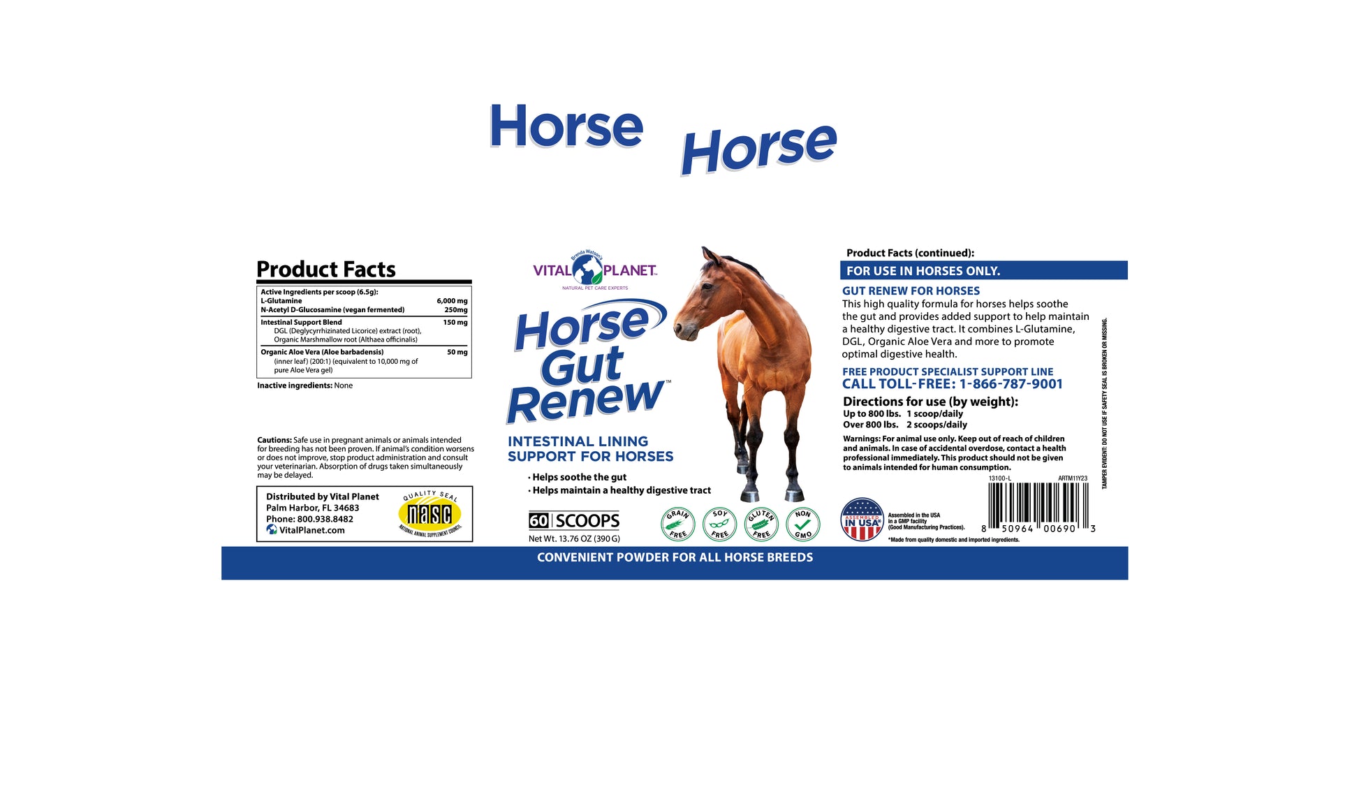 Siéntase más seguro al cuidar el revestimiento intestinal de su caballo. HORSE GUT RENEW es una fórmula avanzada para la salud digestiva, formulada por expertos para promover la integridad del revestimiento intestinal y aliviar molestias gástricas ocasionales.