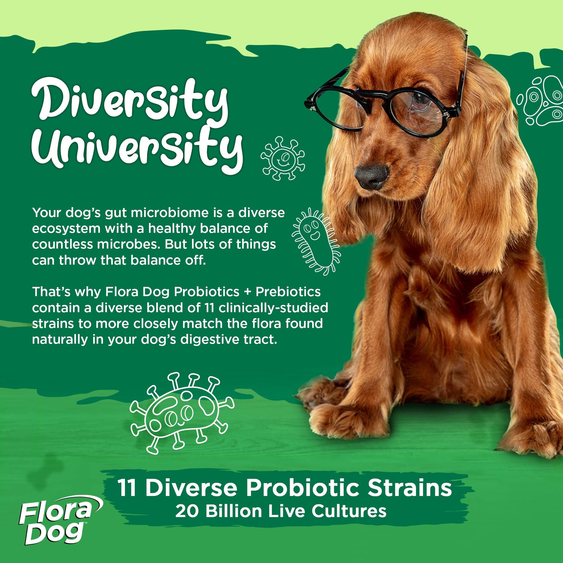 Siéntete más seguro con el probiótico diario de tu perro. FLORA DOG es un probiótico de alta potencia y diversidad que te ayuda a apoyar la salud digestiva e inmunitaria de tu cachorro a diario.