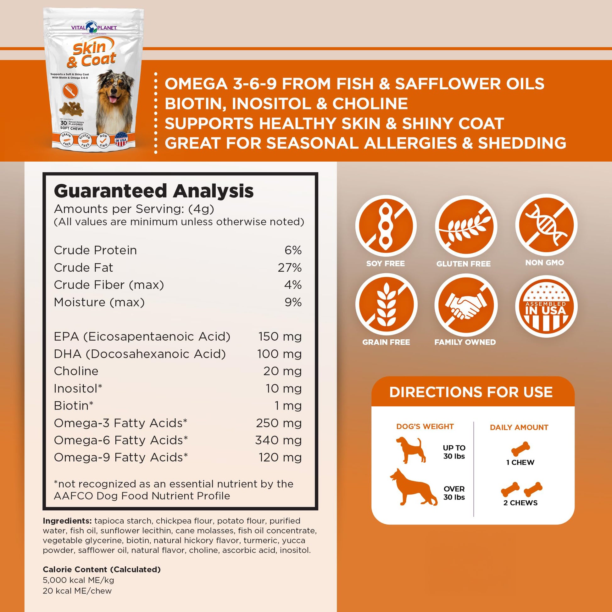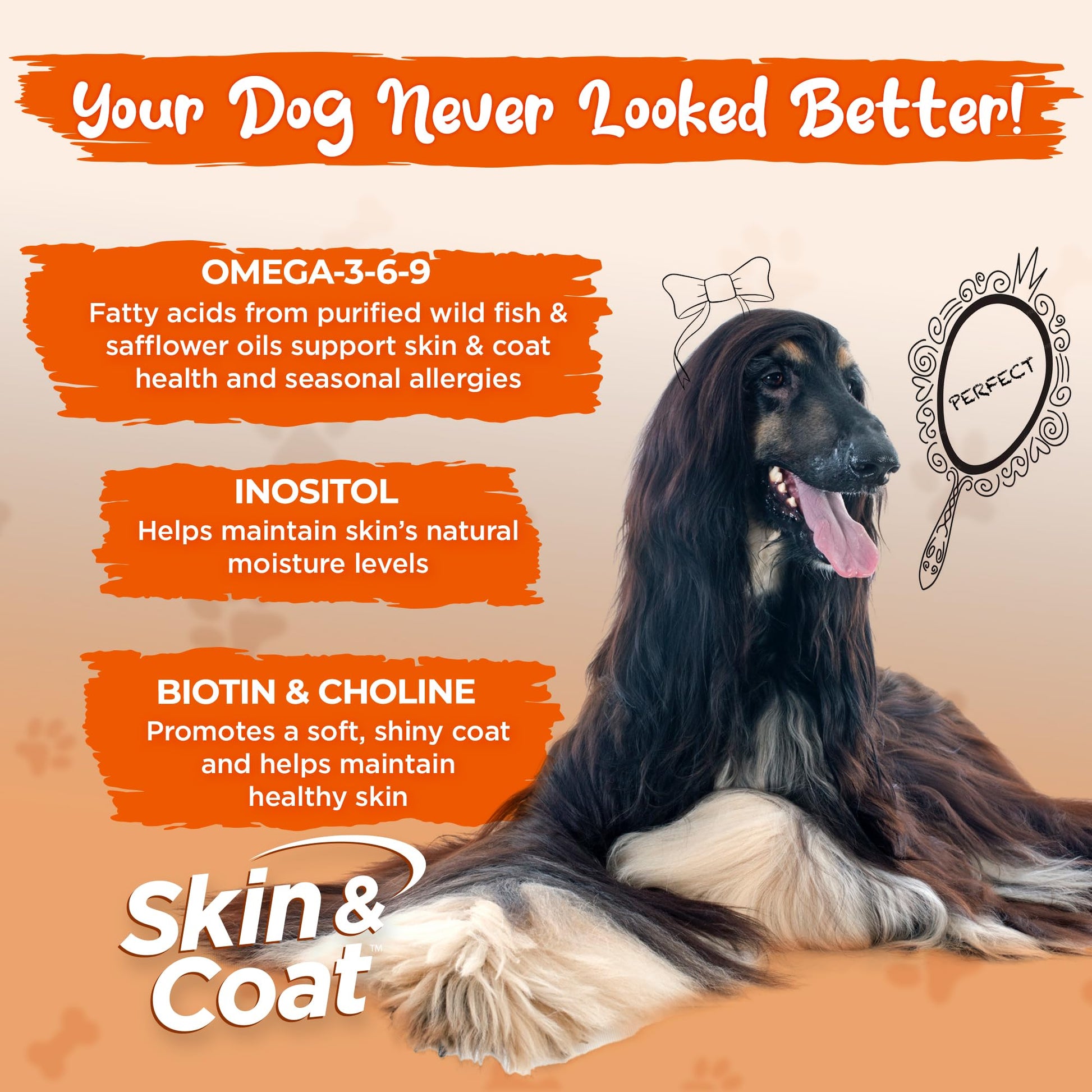 - Fórmula única y natural para la piel y el pelaje canino con Omega-3-6-9 de pescado silvestre purificado, semillas de lino y calabaza, además de biotina, inositol y colina.
