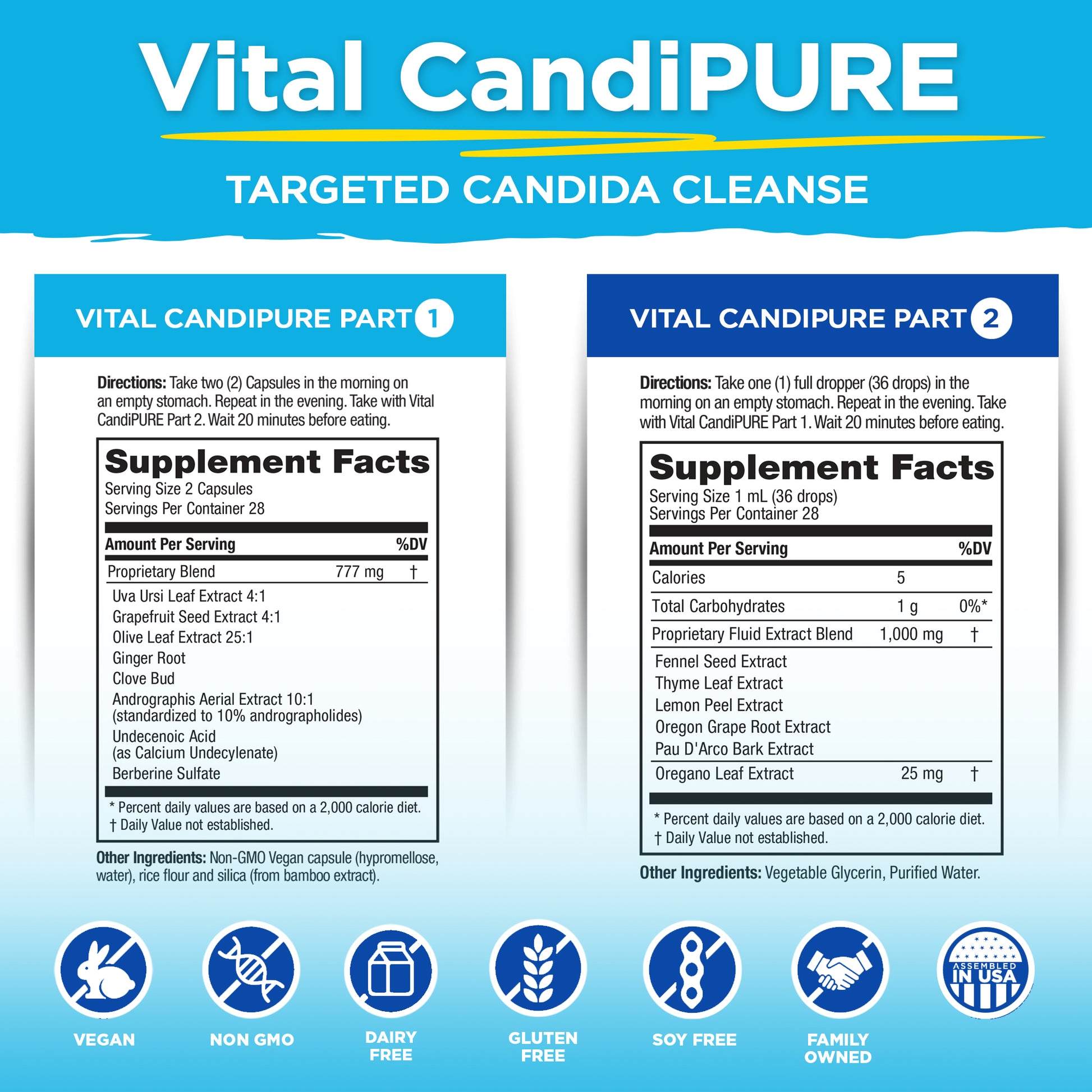 - Parte 1: Una mezcla equilibrante única y potente de Uva Ursi, pomelo, hoja de olivo, jengibre, clavo, andrographis, ácido undecenoico y berberina.