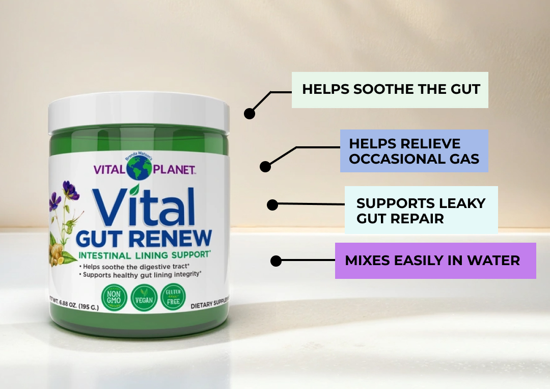 Vital Gut Renew™ is designed to support and tighten those gaps so your gut lining stays strong, sealed, and working the way it should. It does this by providing natural L-Glutamine that feeds the probiotics lining your gut