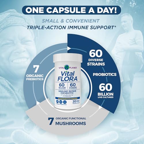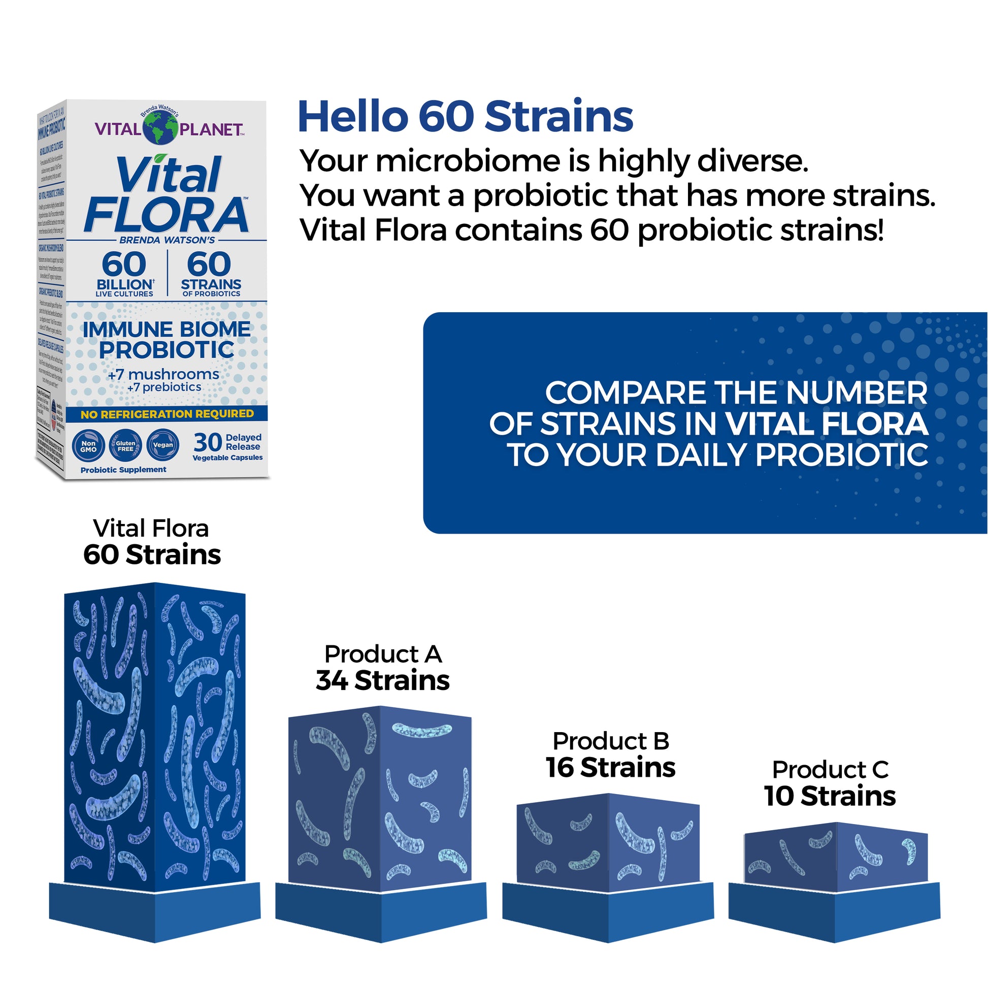 A healthy gut contains a highly diverse balance of good probiotics. To more closely match this natural diversity, Vital Flora probiotics contain 60 different Lacto and Bifido strains.