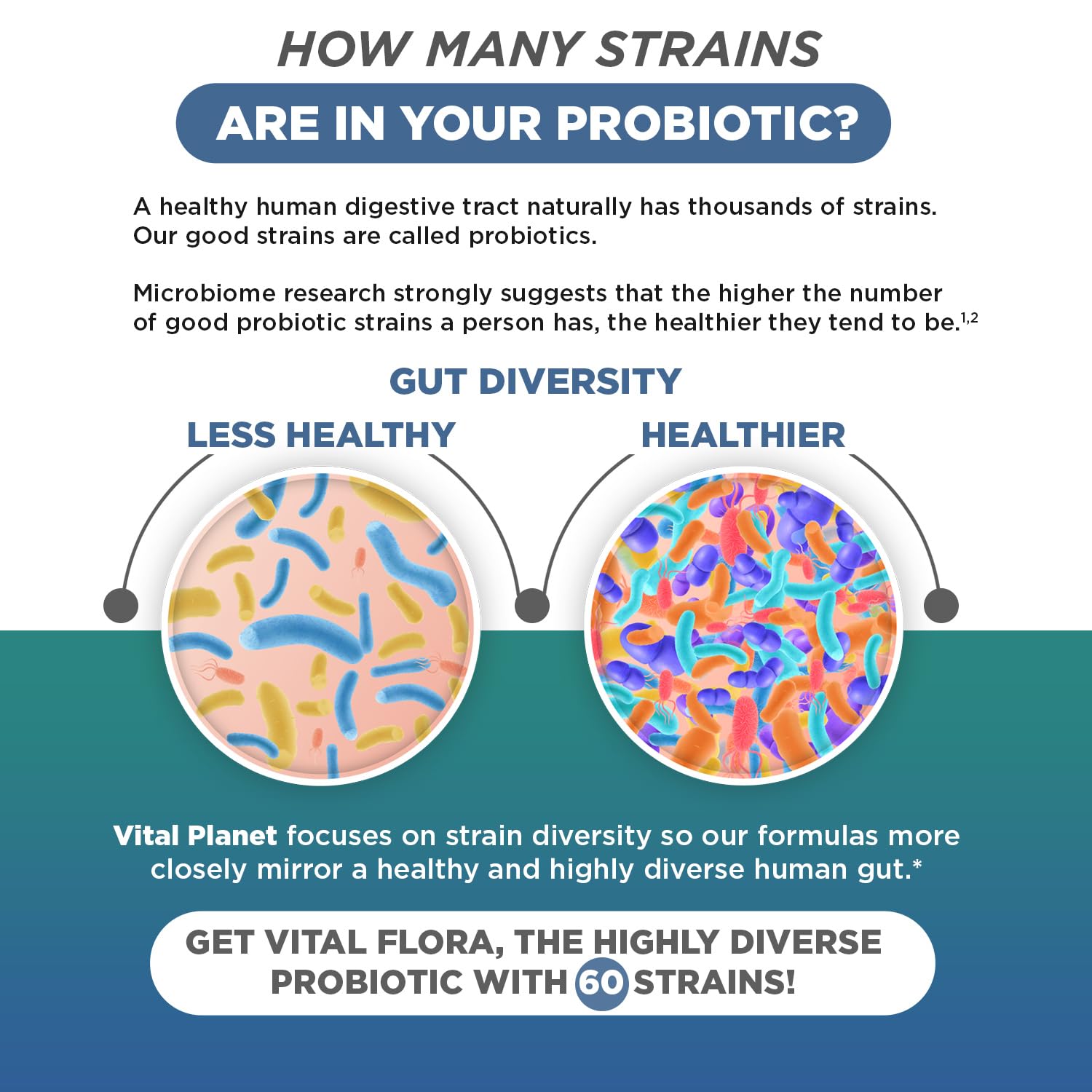 A healthy gut contains a highly diverse balance of good probiotics. To more closely match this natural diversity, Vital Flora probiotics contain 60 different Lacto and Bifido strains.