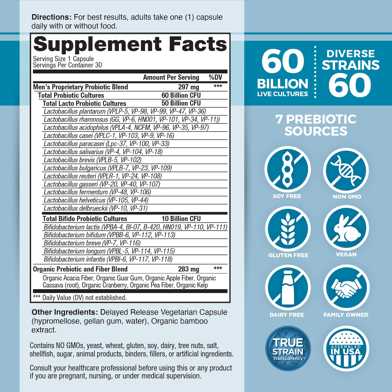 Vital Flora Men’s Daily Probiotic, 60 Billion CFU, 60 Diverse Strains For Men + 7 Organic Prebiotics