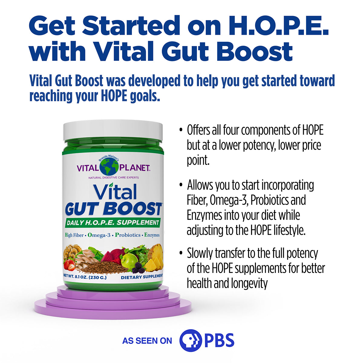 Vital Gut Boost provides all four daily supplements of the H.O.P.E. Formula – Fiber, Omega Oil, Probiotics, and Enzymes.
